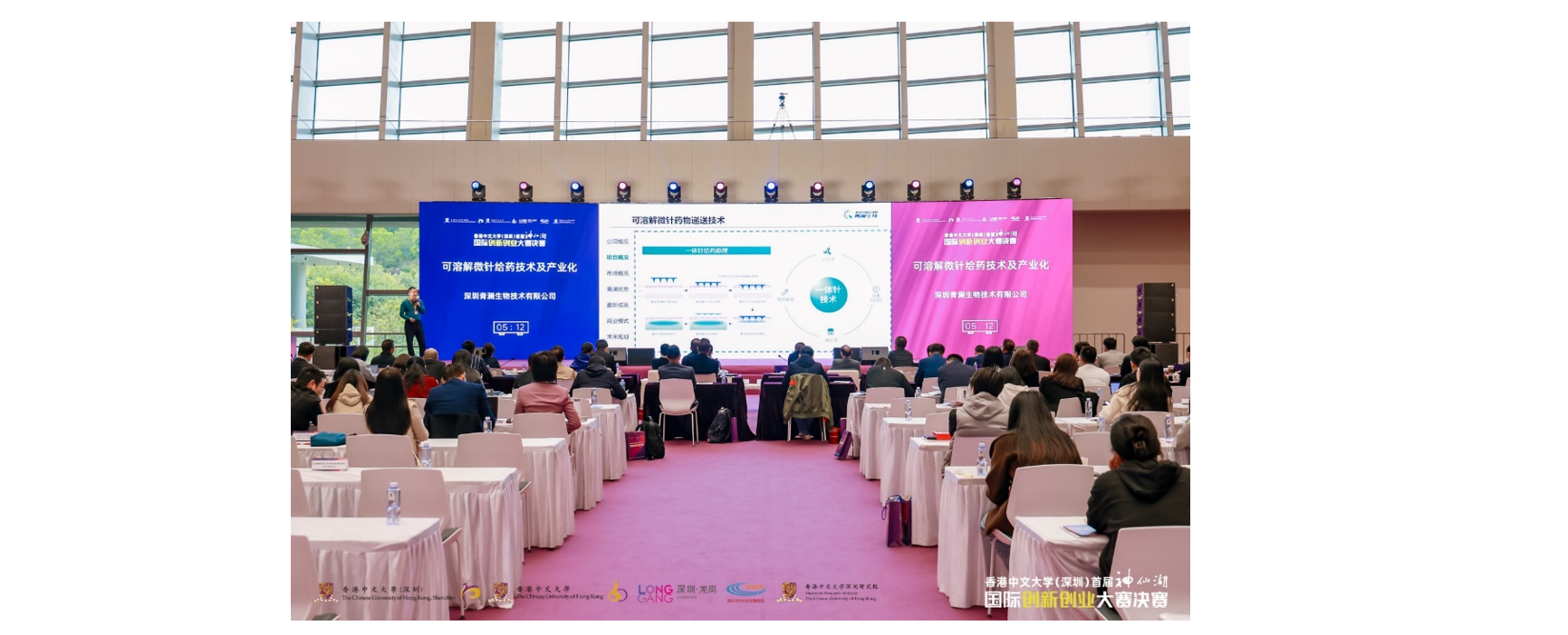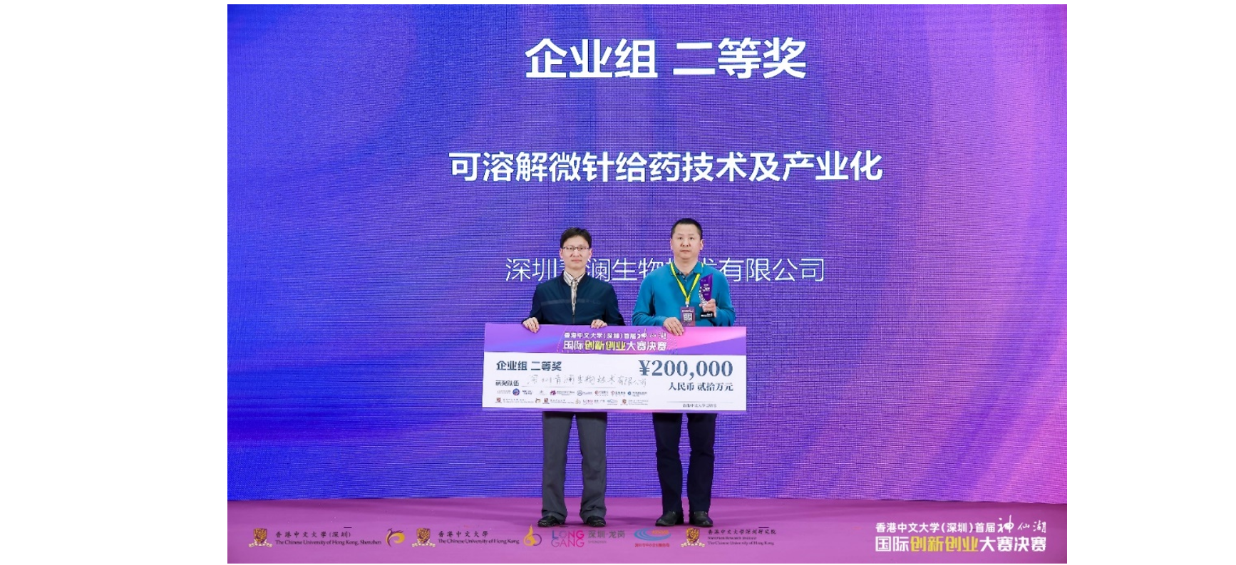 決賽伊始,香港中文大學(深圳)校長、中國工程院院士徐揚生教授發(fā)表了開場致辭。他表示,本次創(chuàng)新創(chuàng)業(yè)大賽是一次盛會,在港中大(深圳)建校十周年之際舉辦具有重要意義。希望以此次大賽為契機來搭建一個大灣區(qū)校企合作平臺,吸引越來越多的優(yōu)秀創(chuàng)新創(chuàng)業(yè)項目落地深圳、共同推動深圳創(chuàng)新發(fā)展。本次決賽邀請了包括頂尖投資機構(gòu)、行業(yè)龍頭企業(yè)等在內(nèi)的10位專家評委和20位嘉賓評委組成的強大評委陣容,經(jīng)過6個多小時的激烈角逐,共評出創(chuàng)客組和企業(yè)組各1名一等獎、1名二等獎和1名三等獎,其余均獲得優(yōu)秀獎。決賽采取“7+5”模式,即每個項目7分鐘路演+5分鐘評委提問。決賽過程中,青瀾生物總經(jīng)理江林博士從技術(shù)產(chǎn)品、商業(yè)模式及實施方案、行業(yè)市場、公司團隊、財務(wù)分析等多個方面,對“可溶解微針給藥技術(shù)及產(chǎn)業(yè)化項目”進行了全面而深入的演說與分享。因為本次比賽不區(qū)分行業(yè)賽道,因此評委團構(gòu)成人數(shù)眾多,每個賽道均由五六名專業(yè)評委組成,評委總?cè)藬?shù)超過30人。在評委溝通互動環(huán)節(jié),評委們對青瀾生物可溶解微針項目表現(xiàn)出非常高的參與積極性,從可溶解微針的技術(shù)難點、知識產(chǎn)權(quán)、適用的藥物種類、客戶開拓以及相較同行的優(yōu)勢等多方面進行提問,江林均針對性地進行了專業(yè)回復,現(xiàn)場互動氣氛專業(yè)、活躍、契合。本次比賽采取現(xiàn)場打分,比賽結(jié)束后答辯企業(yè)與組委會現(xiàn)場簽字確認成績,確保了比賽的公平公正。隨著所有項目的路演結(jié)束,大賽進入了激動人心的公布成績階段,青瀾生物表現(xiàn)驚艷,在所有參賽企業(yè)中取得第二名的好成績,獲得了二等獎。最后大賽進入了激動人心的頒獎典禮,深圳市中小企業(yè)服務(wù)局副局長兼綜合處處長胡小劍為青瀾生物頒發(fā)獎項,本屆大賽圓滿落幕。