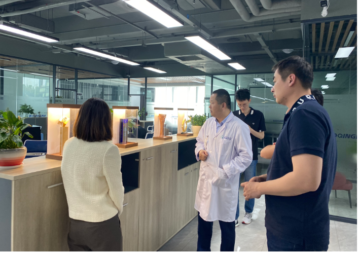 江林博士親自擔(dān)任東道主,以熱情的接待表達了對此次交流的高度重視。貴賓們在江林博士的引領(lǐng)下參觀了青瀾生物的研發(fā)實驗室和辦公區(qū)域,在公司所獲成果和榮譽展示墻前,江林博士對這些年的各種參賽經(jīng)歷如數(shù)家珍,侃侃而談。接下來的會議更加精彩,江林博士展示了青瀾生物的整體公司情況,展現(xiàn)出其行業(yè)領(lǐng)先的技術(shù)實力和創(chuàng)新能力。研發(fā)總監(jiān)潘施敏詳細介紹了可溶解微針技術(shù)藥物研究成果,質(zhì)量總監(jiān)李行友闡述了公司質(zhì)量體系的運行情況,生產(chǎn)及設(shè)備開發(fā)部經(jīng)理歐陽星則介紹了可溶解微針技術(shù)工廠的生產(chǎn)狀況和產(chǎn)能。在我方介紹的最后部分,江林博士詳細闡述了青瀾生物與多家知名藥企建立的合作關(guān)系及商業(yè)策略,以上策略均顯著加深了在座貴賓對青瀾生物合作交流與未來前景的認識。