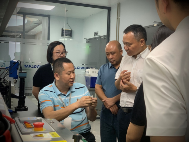 江林同時作為公司首席科學(xué)家?guī)ьI(lǐng)區(qū)政府領(lǐng)導(dǎo)們先后參觀了公司的總部和研發(fā)中心,就可溶解微針技術(shù)的原理和全球領(lǐng)域產(chǎn)業(yè)化進(jìn)展情況進(jìn)行了簡要介紹,同時邀請考察團零距離觀摩體驗青瀾生物的可溶解微針產(chǎn)品,直觀感受可溶解微針給藥技術(shù)的優(yōu)勢與創(chuàng)新性。羅開敏一行人對青瀾生物在該技術(shù)上取得的突破性成果及公司的科研和產(chǎn)業(yè)化實力給予了高度評價。
