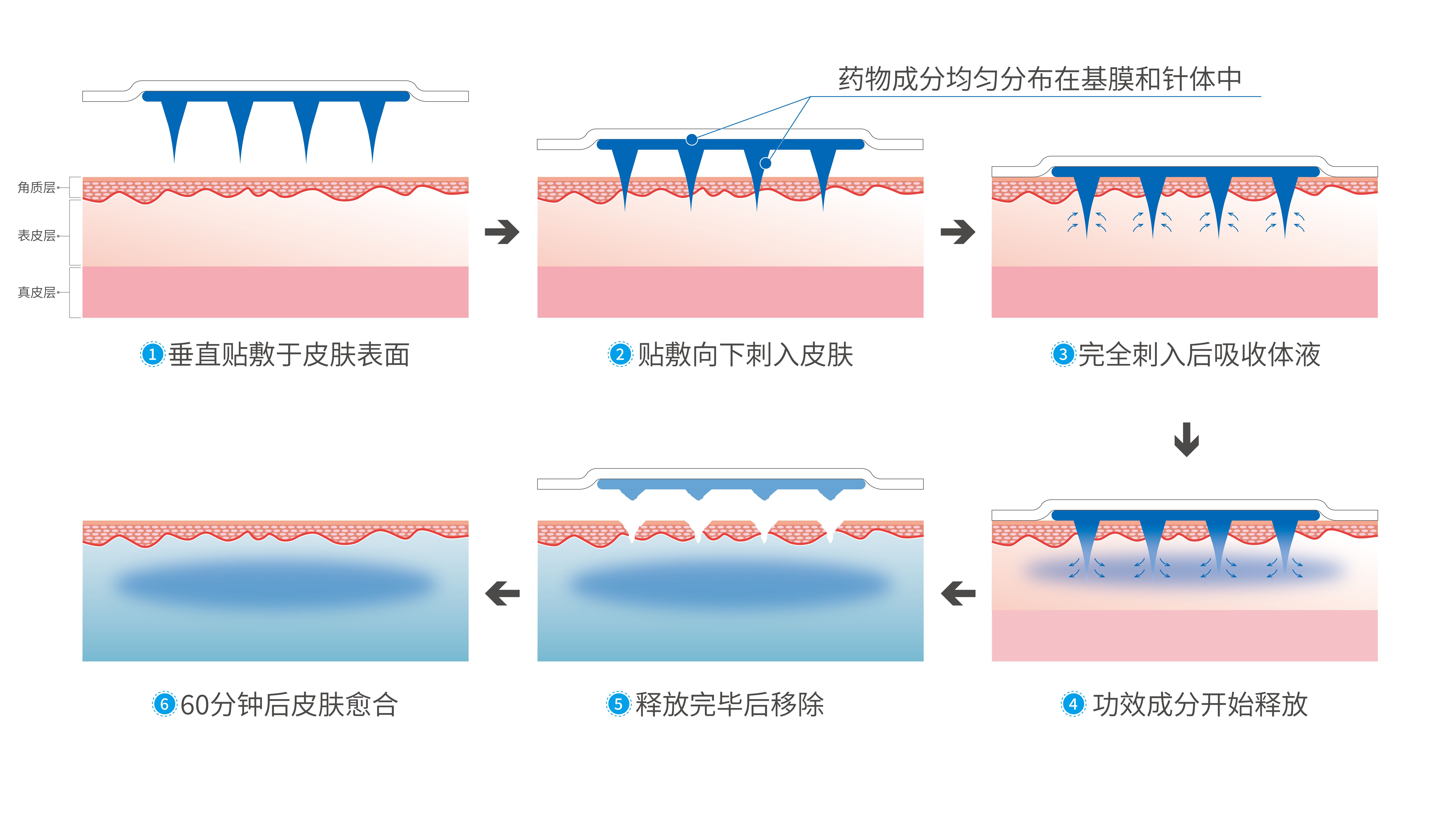 無(wú)痛微創(chuàng),依從性高 微針高度小于450微米,刺穿皮膚角質(zhì)層到達(dá)到表皮層吸收體液溶解釋放,不會(huì)觸及到真皮層的神經(jīng)末梢和毛細(xì)血管,患者不會(huì)感覺(jué)到疼痛也不會(huì)出血,無(wú)痛微創(chuàng)患者依從性高。 -